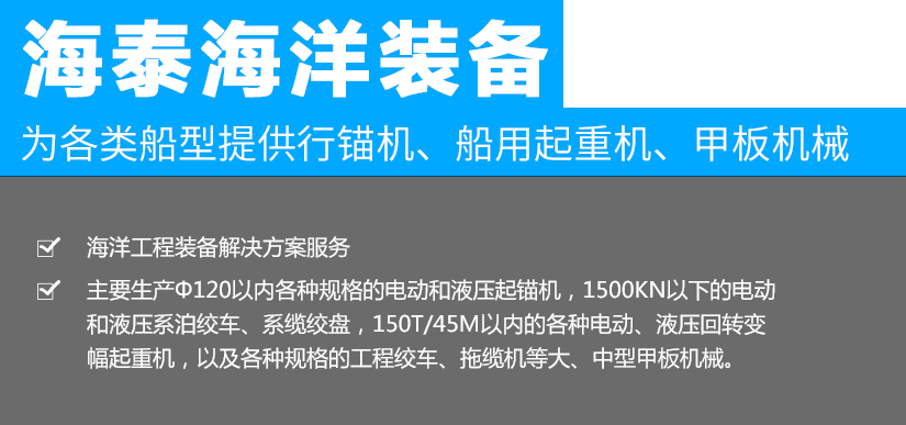 常規航行錨機、系泊絞車、系纜絞 電動(或液壓)起錨機、起錨絞盤 電動(或液壓)系泊絞車 電動(或液壓)系纜絞盤 YQ型電動液壓起重機 港口拖輪、三用工作船用設備 艏部航行錨兼拖帶絞車新聞資訊